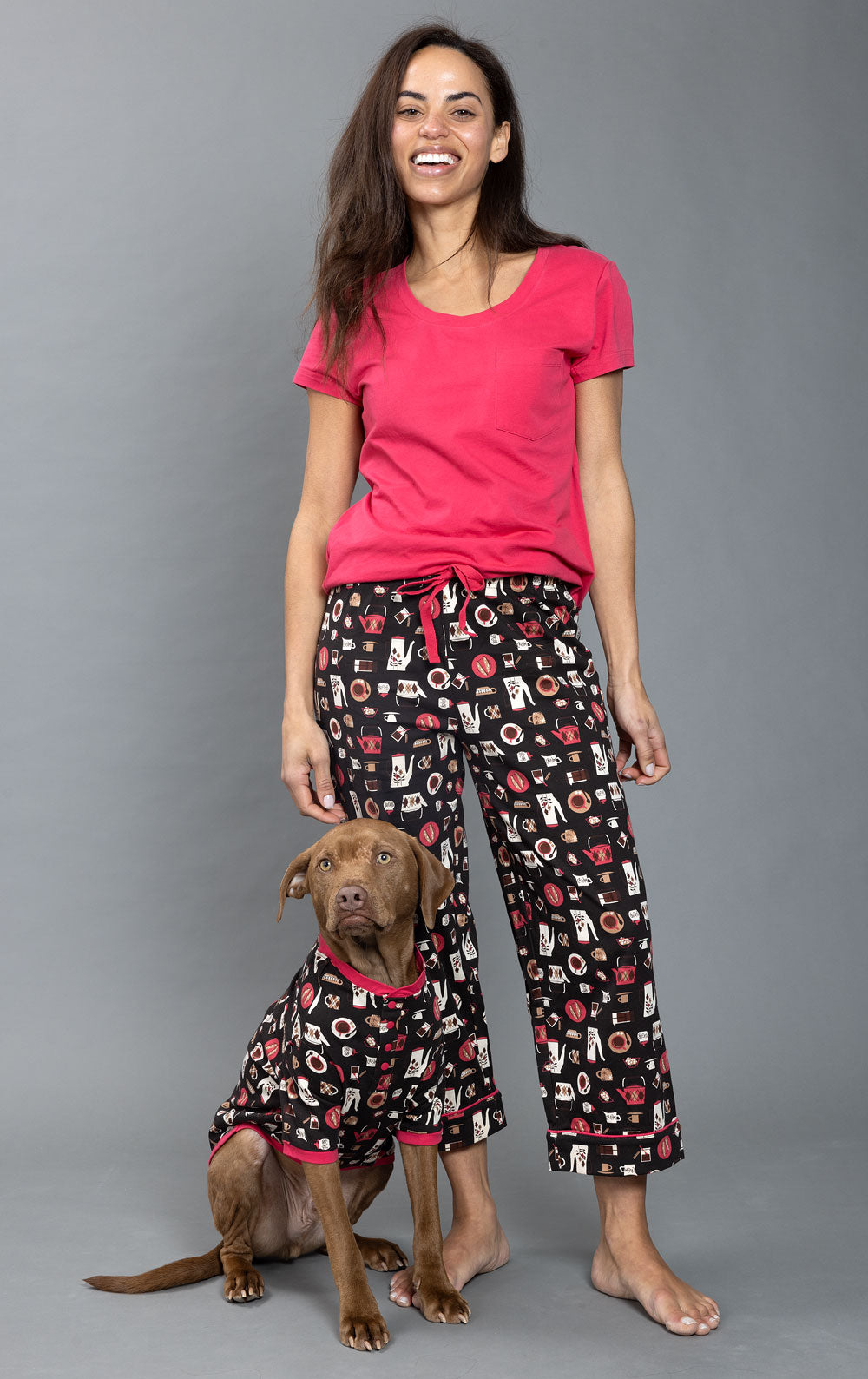 The Coffee Lovers Matching Pet & Owner Pajamas are a slow morning dream. Made for sipping a favorite brew while snuggling a favorite fur baby, this set includes short sleeve, capri owner pajamas paired with short sleeve pet pajamas. Boasting an adorable pattern of coffee pots and mugs, both styles are made of a smooth jersey material.