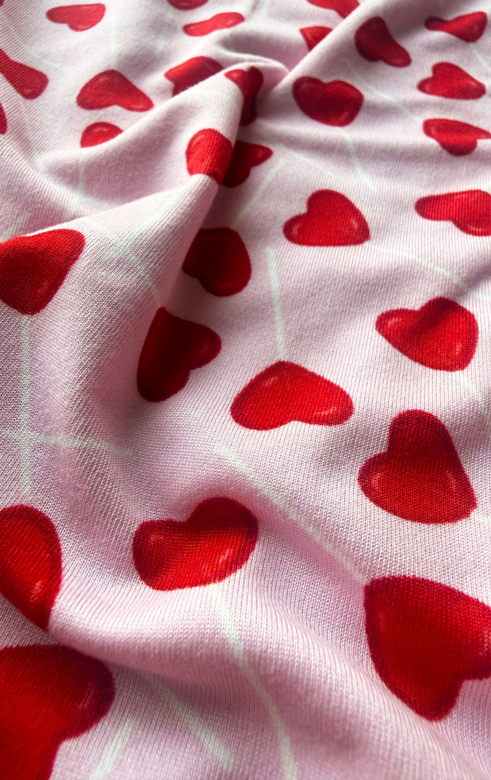 The Lollipop Heart Pet Pajamas are sweet like candy and extra cozy. A deliciously soft addition to bedtime, this short sleeve onesie includes a placket neckline, snap closures, and a curved hem for an ideal fit. Complete with a light pink color covered in a pattern of red heart-shaped lollipops, these snug-fitting pajamas are made of a stretchy jersey that washes exceptionally well and moves with the body.
