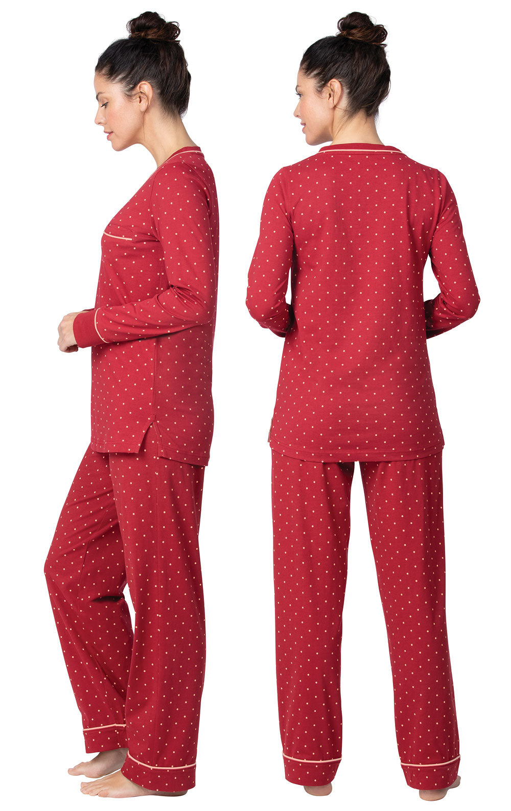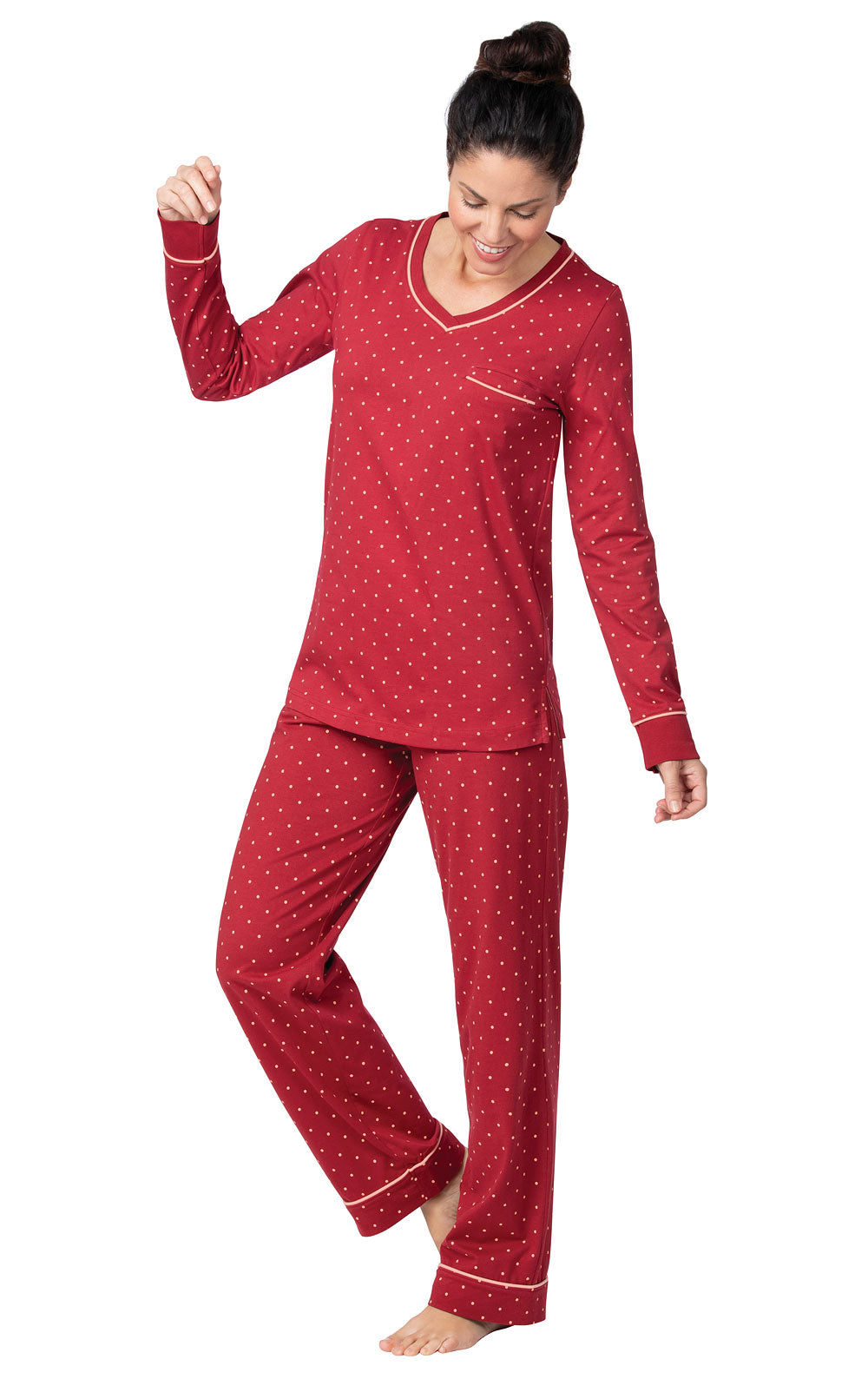These Red & Pink double brushed, 100% cotton pullover pajamas are just right for around the house and, of course, to bed. Made of a soft, breathable jersey material, the long sleeve, v-neck, slightly fitted top and the relaxed fit, elastic waist, drawstring pants with front pockets both feature matching polka dots. Wear this set in all seasons and enjoy endless, cozy comfort.