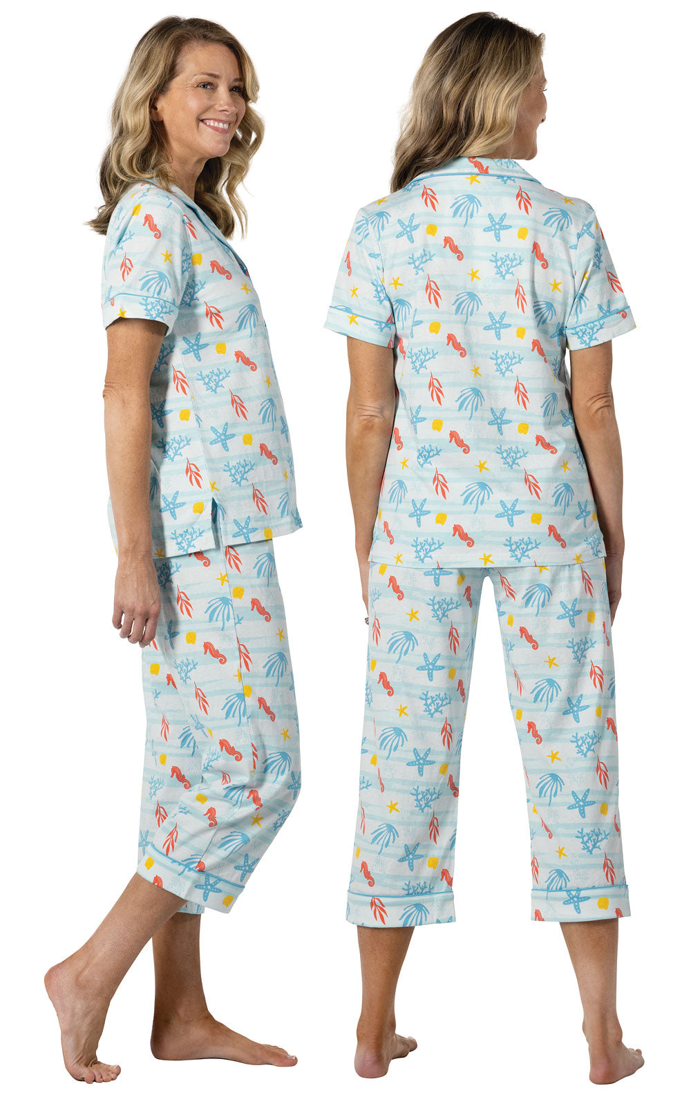 Refresh after a long day in the Printed Short Sleeve Button-Front Capri Pajamas. Made of a soft, breathable 100% cotton that holds its shape and color wash after wash, this two-piece set offers nothing but rejuvenating relaxation. As easy to wear as comfy, these pajamas have short sleeves, a notched collar, a chest pocket, buttons, and an elastic waistband with drawstring. Covered in a lovely pattern, there is no better warm weather set to sleep in.