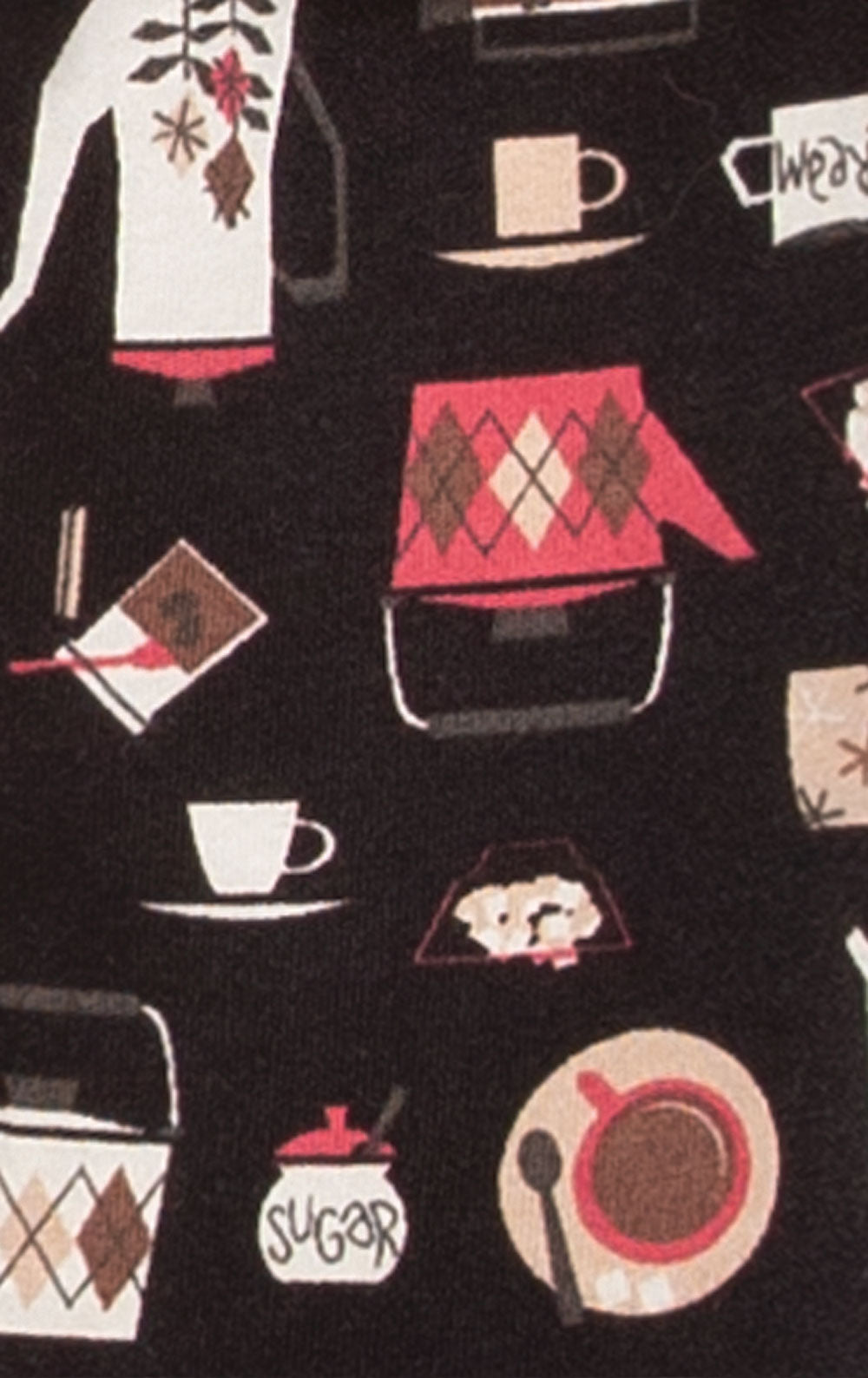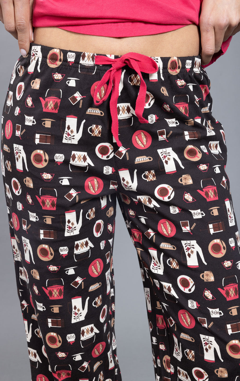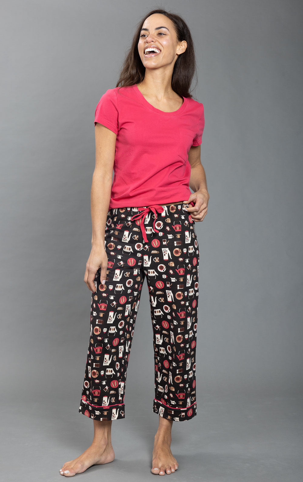 Rise and shine. Wake up ready to take on the day in the Coffee Lovers Pocket Tee Capri Pajamas. The solid color shirt includes short sleeves, a scoop neckline, a chest pocket and a curved hem, plus it is relaxed fit for superior comfort while sleeping. The pants feature a cute vintage coffee pattern, an elastic waistband, a drawstring, and a cropped length. Made from a smooth jersey fabric, this set is sure to be a favorite for years to come.